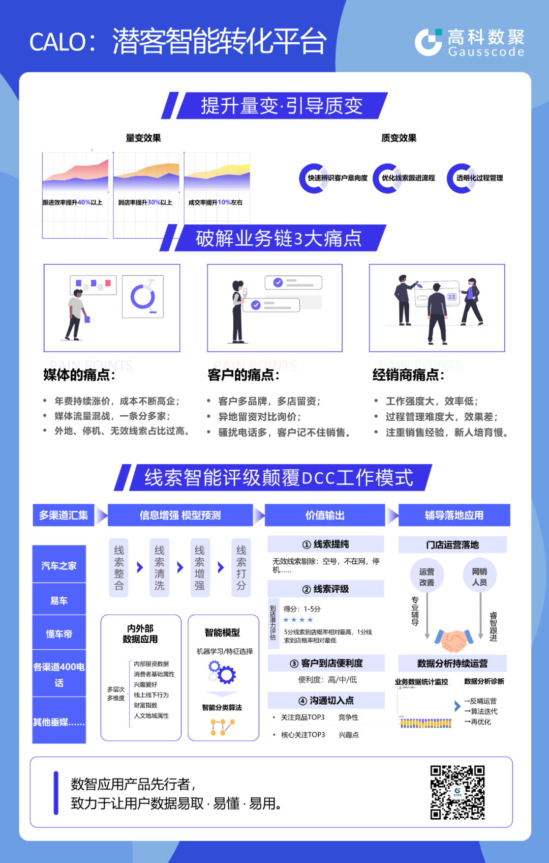 线索转化到店智能引擎(CALO),是一款综合人、车、店三大维度,以消费者大数据为核心,结合诸多维度数据建模的销售线索转换大数据智能产品。顺利获得对店端历史数据进行学习,以及模型自身具有“机器学习”功能,分析线索到店、成交意向,并用“一店一模型”的定制方式,为每条线索最终产出线索评级、距离、竞品和关注点等价值输出。